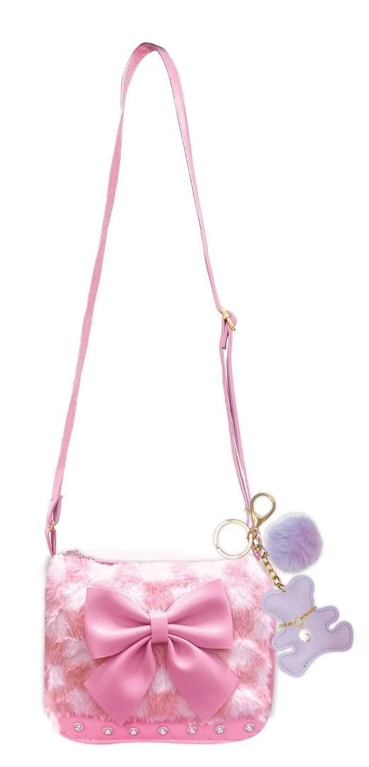 Torebeczka pomieści niezbędne akcesoria małej miłośniczki mody i trendów. Przód torebki pokryty został modnym futerkiem i ozdobiony kokardką. Dołączony pasujący miękki breloczek w kształcie misia. Rączka torebki jest regulowana. Zapina się na magnetyczny guziczek. Wiek: 5+