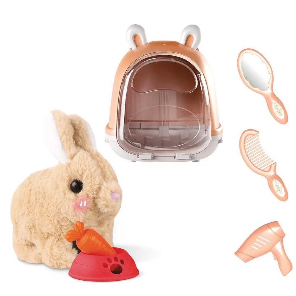 Twój Pupilek - zajączek z domkiem. Zajączek kica do przodu, wydaje dźwięki, rusza noskiem i policzkami. W zestawie z akcesoriami: miseczką i marchewką oraz suszarką, grzebieniem i lusterkiem. zasilanie: 2xAA (brak w zestawie) wymiary opakowania: 20.4x14.8x15.5 cm wiek: 3+