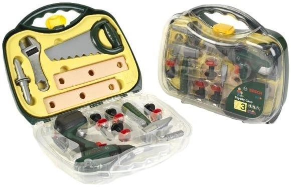 Walizka transparentna z wkrętarką i narzędziami marki Klein pochodzi z serii zabawek Bosch mini powstałej na licencji firmy Bosch, dlatego też narzędzia wchodzące w jej skład są wiernymi kopiami faktycznie istniejących narzędzi tej marki. Zestaw zapakowany jest w solidną walizkę w kolorze ciemno-zielonym, z wygodnym profilowanym uchwytem i transparentnym froncie, dzięki czemu dzieci będą wiedzieć, co znajduje się w walizce nawet bez jej otwierania. Walizka posiada żółty klips, który ją zamyka, zabezpieczając tym samym narzędzia tego kompletu przed przypadkowym wypadnięciem podczas transportu. W walizce znajdują się narzędzia i akcesoria do zabawy, a głównym narzędziem jest wiertarko-wkrętarka Bosch na baterie (KL 8567). Wiertarko-wkrętarka ma regulowane obroty w prawą i lewą stronę, włączane czerwonym przyciskiem, z boku zabawki, jak również dwie prędkości pracy, regulowane czerwonym przełącznikiem na czole urządzenia. Dodatkowo zabawka ma w komplecie cztery srebrne wymienne bity (wiertła), a także w w podstawie urządzenia białą diodę oświetlającą miejsce pracy. Zabawka jak prawdziwa ma wygodny uchwyt z gumową powierzchnią ułatwiającą utrzymanie zabawki w dziecięcych dłoniach. Wiertarko-wkrętarka podczas swojej pracy wydaje realistyczne dźwięki imitujące odgłosy pracy prawdziwego urządzenia. Ponadto w zestawie znajduje się piła ręczna, młotek, klucz francuski, dwie plastikowe deseczki z otworami do wkręcania śrub, a także 4 śruby z nakrętkami i 2 plastikowe gwoździe. Wszystkie elementy zestawu są wykonane z plastiku, pozbawione ostrych krawędzi i całkowicie bezpieczne dla dziecka. Dzięki wysokiej jakości wykonania śruby wkręca i wykręca się z dużą łatwością. Bawiąc się wiertarko-wkrętarką czy pozostałymi narzędziami walizki dzieci już od najmłodszych lat w bezpieczny sposób będą mogły wcielić się w rolę majsterkowicza, zapewniając sobie realistyczne doświadczenie korzystania z wszystkich jego części. Zestaw umożliwia maluchom kreatywną zabawę i doskonalenie umiejętności manualnych. Dzieci uwielbiają naśladować rodziców wykonujących codzienne czynności domowe lub w nich uczestniczyć, jednak nie zawsze jest to możliwe ze względów bezpieczeństwa, a dzięki tej całkowicie bezpiecznej dla dzieci, zabawkowej walizce z wiertarko-wkrętarką i narzędziami każdy mały majsterkowicz może bezpiecznie robić to, co jego opiekunowie. Zabawka wymaga użycia baterii, które nie są zawarte w zestawie.