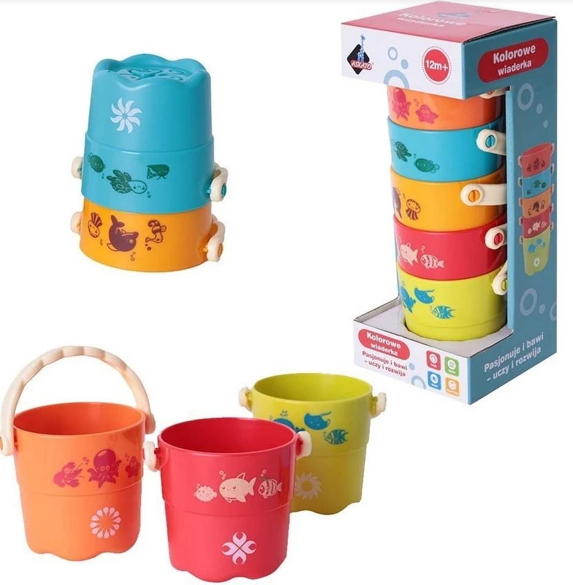 Wiaderka -kubeczki można włożyć jedno w drugie, lub zbudować wieże- co rozwija u maluchów sprawność manualną i koordynację ruchową. Dodatkowo napełnianie ich i opróżnianie, jest fajną zabawą podczas kąpieli oswaja malucha z wodą. Dna wiaderek...