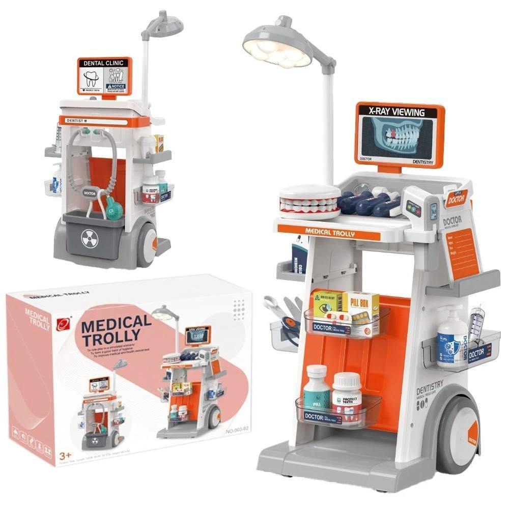 Rozbudowany zestaw dentystyczny z wózkiem na kółkach. Zabawka umożliwia odgrywanie ról, co pomaga dzieciom oswoić się z wizytą u stomatologa. Świetnie rozwija wyobraźnię i uczy troski o zdrowie. Dzięki realistycznemu wykonaniu dziecko poczuje się jak prawdziwy dentysta.
