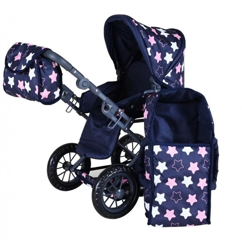 Wózek dla lalek Ruby star blue pink Knorr Toys 63143 Przyciągający wzrok modnym wzorem białych i różowych gwiazdek, wygodny w użytkowaniu granatowy wózek dla lalki z regulowanym daszkiem Ruby Knorr Toys to absolutny must-have dla każdej dziewczynki, która uwielbia wcielać się w rolę troskliwej...