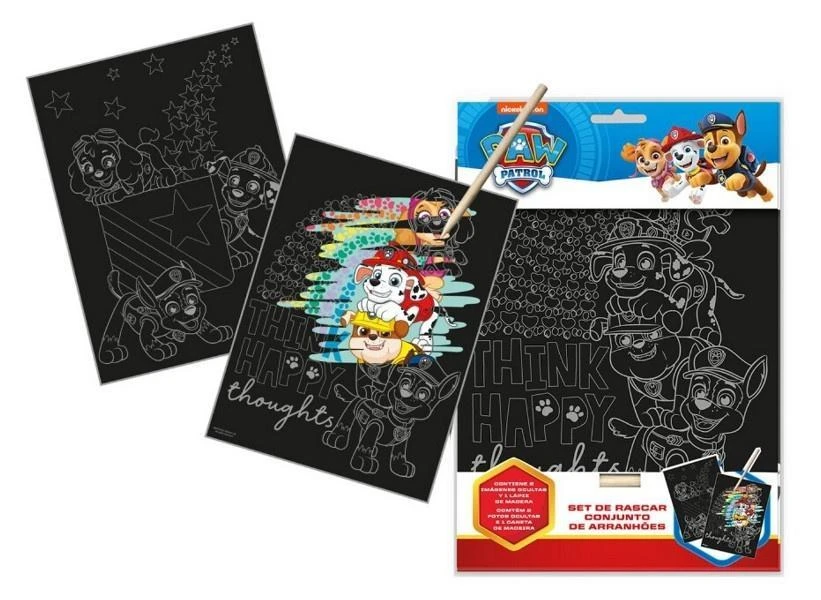 Zestaw kreatywny z ulubionymi bohaterami serialu Psi Patrol. Zawartość: 2 obrazki do wydrapywania, patyczek