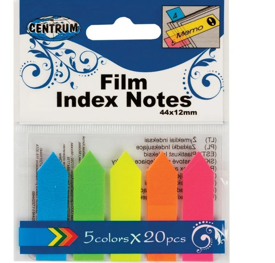 Zakładki indeksujące w kształcie strzałek w 5 neonowych kolorach. Idealnie nadają się np. do zaznaczania ważnych notatek lub stron w dokumentach.