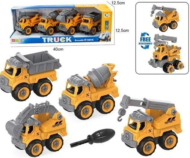 Odkryj ekscytujący świat budownictwa z tym kompletnym zestawem czterech zabawek typu "Assemble Toys". To więcej niż zwykłe samochodziki to interaktywna propozycja, która łączy zabawę z nauką. W skład zestawu wchodzą cztery podstawowe maszyny niezbędne na każdym placu budowy: solidna wywrotka, realistyczna betoniarka, funkcjonalna koparka oraz potężny dźwig. Unikalną cechą produktu jest możliwość pełnego demontażu i ponownego montażu każdego z pojazdów. Proces ten odbywa się za pomocą specjalnie zaprojektowanego, bezpiecznego śrubokręta dołączonego do kompletu.