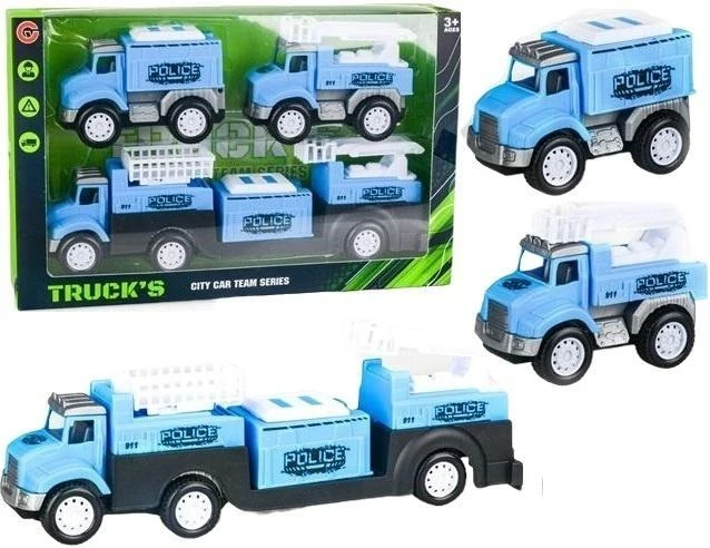 Przedstawiamy dynamiczny zestaw zabawek "TRUCK'S CITY CAR TEAM SERIES", który przeniesie Twoje dziecko w świat ekscytujących pościgów i akcji ratunkowych. Ten kompletny pakiet zawiera dużą, niebieską lawetę, zdolną do transportu trzech mniejszych pojazdów: dwóch samochodów policyjnych oraz jednego wozu strażackiego. Każdy z pojazdów jest precyzyjnie wykonany w żywym odcieniu błękitu z charakterystycznymi czarnymi elementami i napisem "POLICE" oraz numerem "911", co dodaje im autentyczności. Wóz strażacki posiada ruchome elementy, takie jak drabina, co dodatkowo urozmaica zabawę. Zestaw rozwija wyobraźnię, umiejętności manualne i zachęca do odgrywania ról, stając się idealnym prezentem dla każdego małego miłośnika pojazdów specjalnych i przygód. Całość zapakowana jest w estetyczne pudełko, gotowe do podarowania.