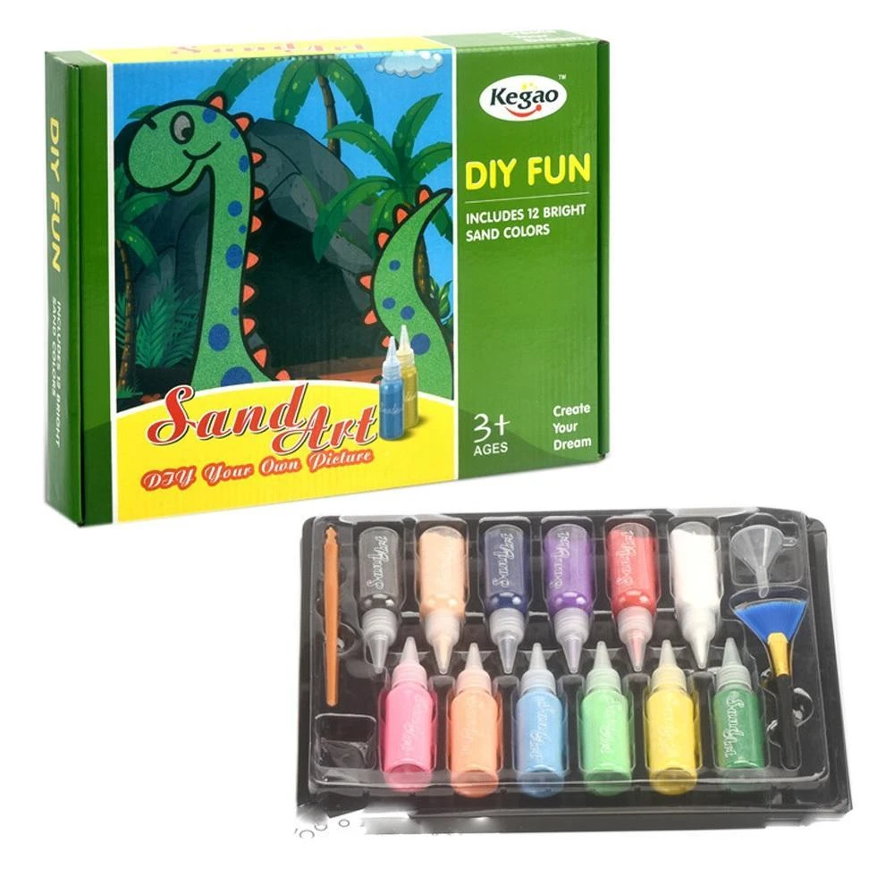 Zestaw zawiera: 8 dużych kart, 16 mniejszych kartek, 12 tubek z kolorowym piaskiem, lejek, szczoteczkę oraz plastikowy patyczek. Wymiary opakowania: 35 x 25 x 5,4 cm