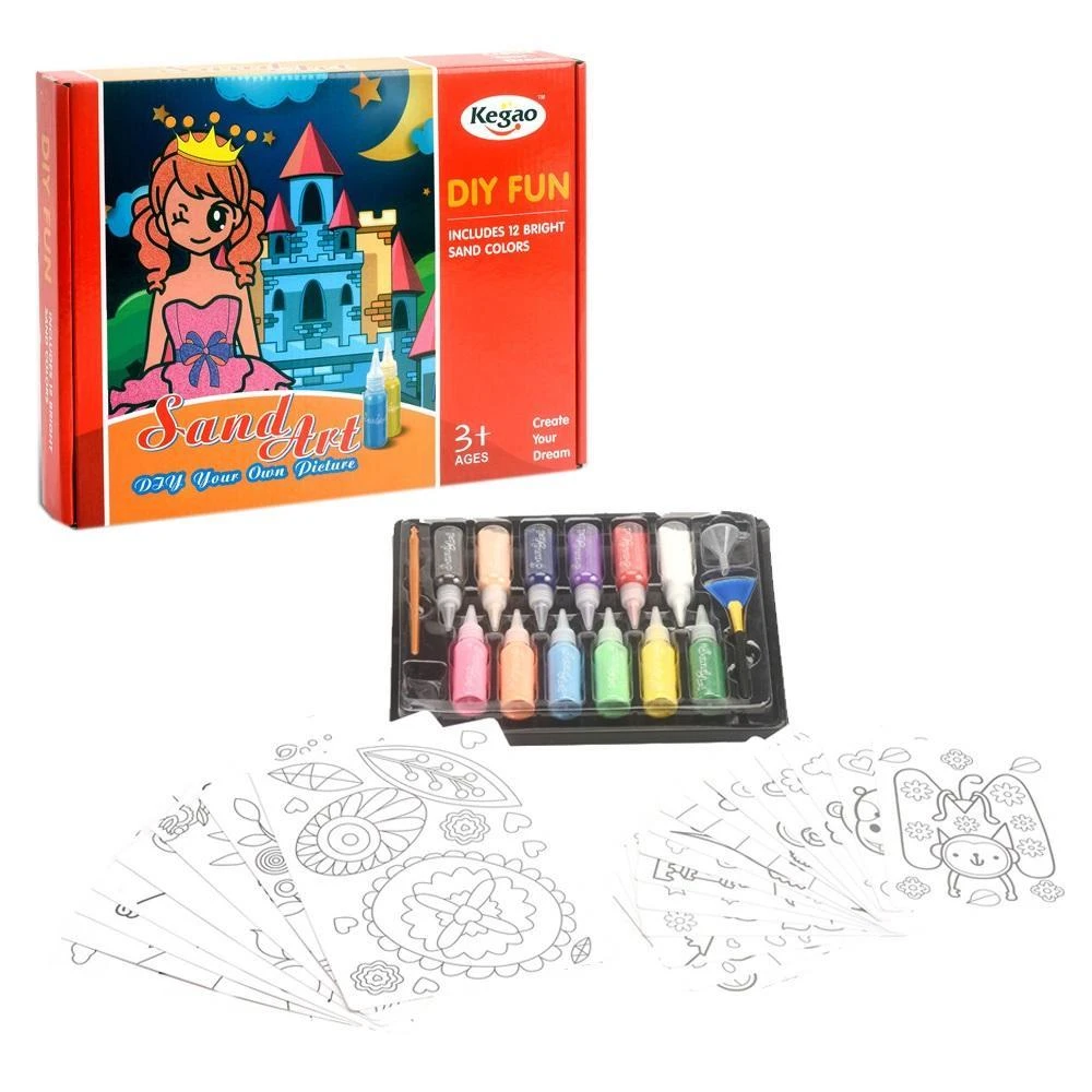 Zestaw zawiera: 8 dużych kart, 16 mniejszych kartek, 12 tubek z kolorowym piaskiem, lejek, szczoteczkę oraz plastikowy patyczek. Wymiary opakowania: 35 x 25 x 5,4 cm