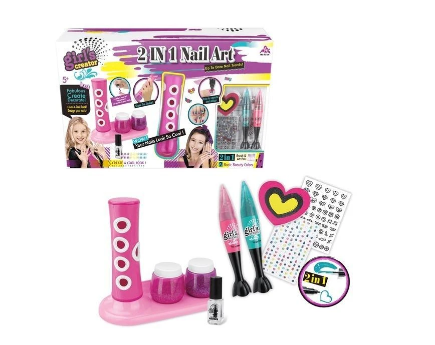 Lakiery 2w1 z pędzelkiem i precyzyjnym pisakiem, brokat, shaker do brokatu, naklejki na paznokcie.