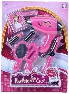Fashion Set, to uroczy zestaw do stylizacji i makijażu, który zachwyci każdą małą elegantkę. Ten bogaty komplet zawiera wszystko, czego potrzebuje przyszła stylistka: różową suszarkę do włosów z motywem szpilki i napisem "I Love You", która jest centralnym elementem zestawu. Ponadto w blistrze znajdziemy praktyczne lusterko z wbudowanym grzebieniem, imitację szminki w eleganckiej czarnej oprawce oraz szczypce lub prostownicę do włosów. Całość utrzymana jest w żywej, przyciągającej wzrok różowej kolorystyce. Zestaw jest przeznaczony dla dzieci w wieku 3 lata i starszych, co potwierdza oznaczenie na opakowaniu. Zabawa tymi akcesoriami doskonale rozwija wyobraźnię, kreatywność oraz umiejętności społeczne poprzez odgrywanie ról. Jest to idealny pomysł na prezent, który pozwoli dziecku na bezpieczne eksperymentowanie ze swoim wyglądem i naśladowanie dorosłych. Wymiary i materiały są dostosowane do małych rączek, gwarantując bezpieczną i angażującą zabawę na długie godziny.
