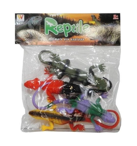 Zestaw 4 kolorowych, piszczących jaszczurek. Produkt zapakowany w przezroczysty worek. Produkt przeznaczony dla dzieci od 3 lat. Podane wymiary są wymiarami opakowania.