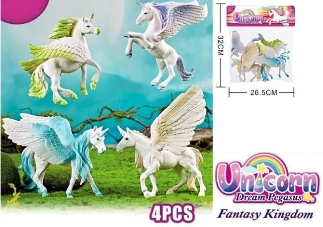 Odkryj magiczny świat Unicorn Dream Pegasus z naszym 4-częściowym zestawem figurek! Zanurz się w fantastycznej krainie Unicorn Dream Pegasus, gdzie marzenia o lataniu stają się rzeczywistością. Ten wyjątkowy zestaw zawiera cztery przepiękne figurki przedstawiające majestatyczne jednorożce obdarzone anielskimi skrzydłami. Każda z nich została starannie wykonana z dbałością o detale, zachwycając bogatą kolorystyką i realistycznym wyglądem. Te urocze pegazorożce są idealne dla małych i dużych miłośników magicznych stworzeń. Mogą stać się wspaniałymi towarzyszami zabaw, inspirując do tworzenia niesamowitych historii i przygód w wyobraźni. Doskonale sprawdzą się również jako unikatowe elementy kolekcji, dodając odrobinę baśniowego uroku do każdego wnętrza. Zestaw zawiera 4 różnorodne figurki, zapakowane w kolorowe pudełko o wymiarach 32 cm x 26.5 cm, co czyni go również świetnym pomysłem na prezent. Podaruj bliskim odrobinę magii i pozwól im rozwinąć skrzydła wyobraźni z Unicorn Dream Pegasus!