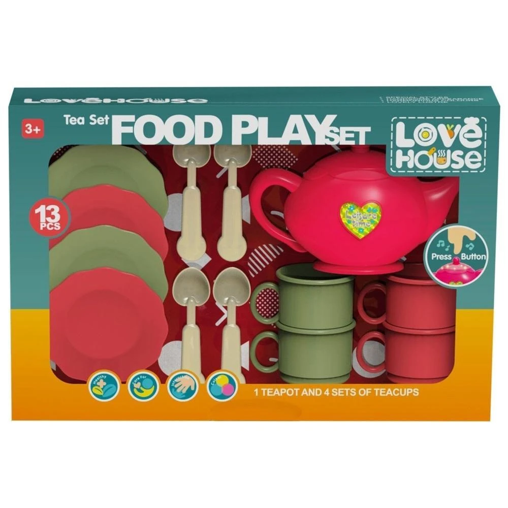 4 filiżanki, 4 talerzyki, 4 łyżeczki oraz czajniczek z muzyką i światłem.