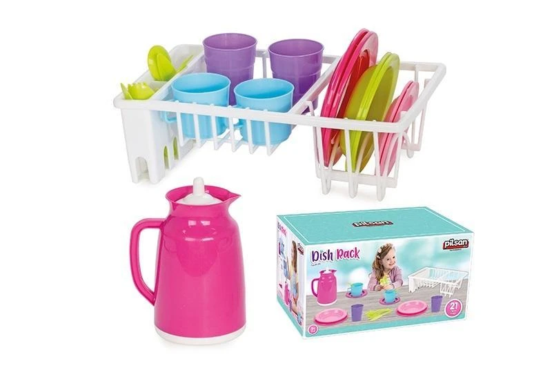 W zestawie: suszarka do naczyń, 2 duże talerze, 2 małe talerzyki, 2 miseczki, dzbanek, 2 kubki, 2 szklanki, 2 zestawy sztućców, wymiary suszarki: 29 x 18 x 9 cm.