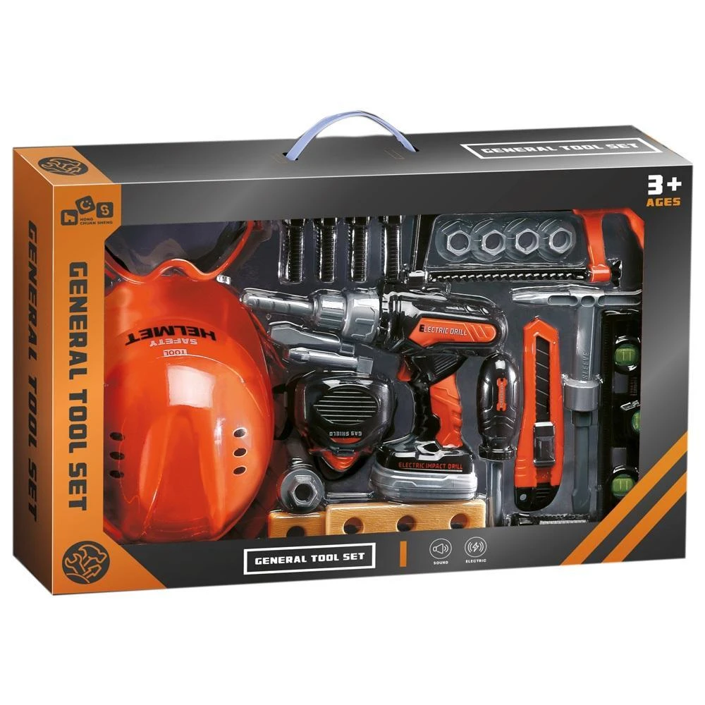 Duży zestaw narzędzi - 25 elementów. Zawiera między innymi wiertarko-wkrętarkę, kask, okulary ochronne, piłę, miarkę, śrubokręt i inne potrzebne drobiazgi do majsterkowania. Wymagane baterie - 2xAA (niedołączone).