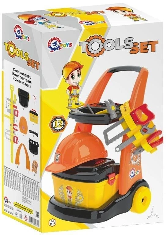 W zestawie m. in.: wózek na narzędzia, kask, pas, piła do metalu i piła do drewna, młotek, klucz, śrubokręt.