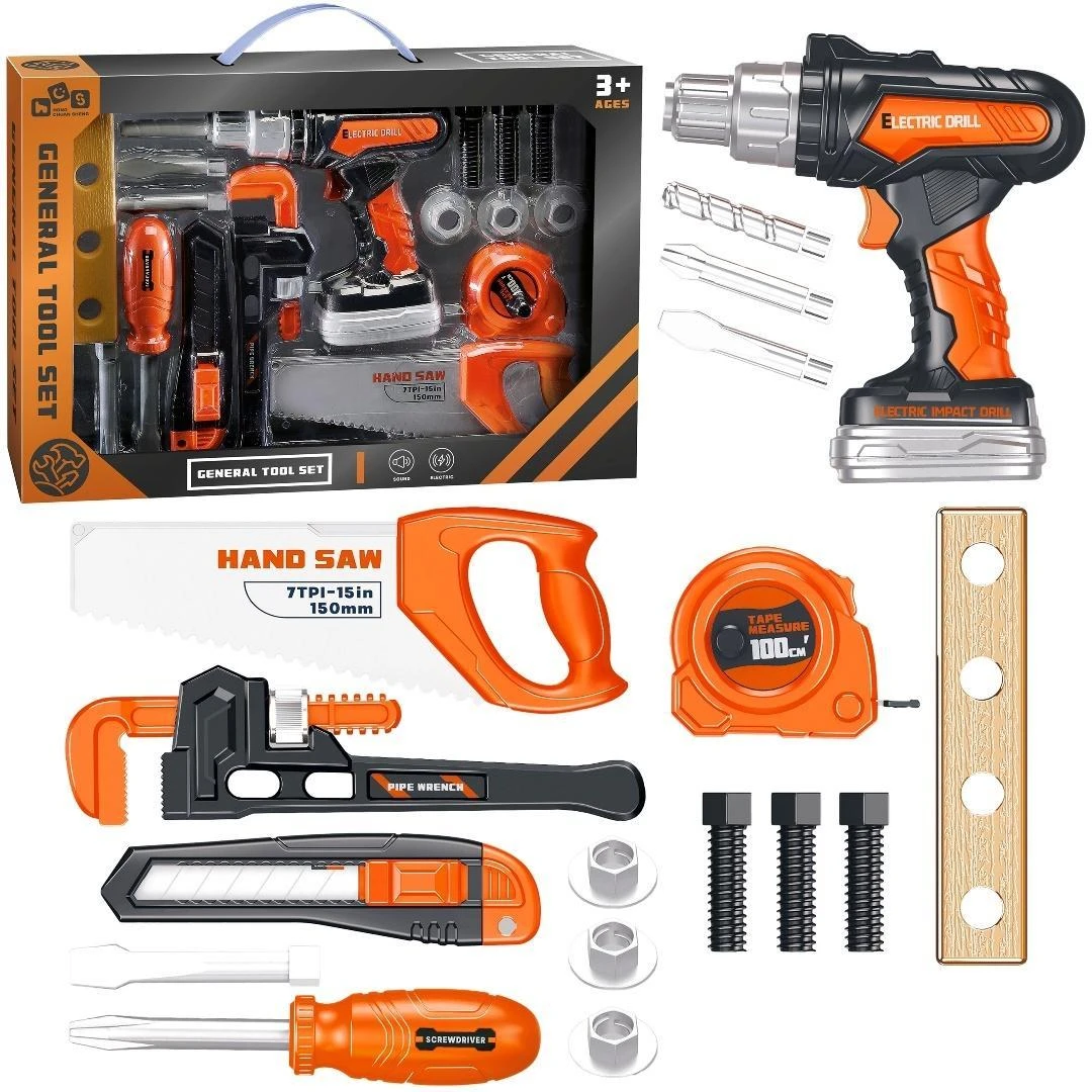 Wiertarka Elektryczna (Electric Drill): Realistyczna wiertarka na baterie, która obraca się i wydaje dźwięki (proszę zweryfikować, czy funkcja dźwięku/światła jest aktywna w tym modelu). Jest bezpieczna dla dzieci, a jej wymienne wiertła (atrapy) dodają realizmu.