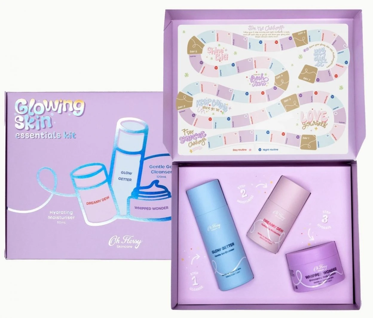 Oh Flossy Zestaw Pierwszej Pielęgnacji Twarzy i Ciała to gotowe rozwiązanie: trzy starannie dobrane kosmetyki, które razem tworzą kompletny, trzystopniowy rytuał - oczyszczanie twarzy, nawilżanie twarzy i pielęgnacja ciała. Nic więcej nie potrzeba.