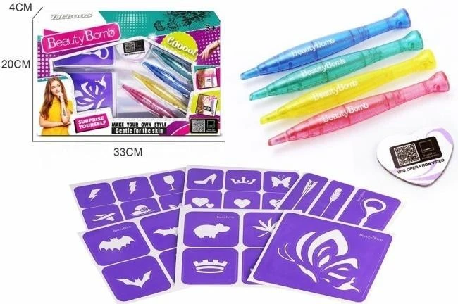 Każda młoda miłośniczka mody marzy o tym, by móc samodzielnie kreować swój wizerunek i dodawać blasku codziennym stylizacjom. Zestaw Beauty Bomb to profesjonalne studio tatuażu w zasięgu ręki, które zamieni dziecięcy pokój w centrum artystycznej twórczości. Sercem zestawu są cztery transparentne pisaki wypełnione intensywnymi barwami z lśniącymi drobinkami, które miękko prowadzą się po skórze, zostawiając na niej trwały, a jednocześnie łatwo zmywalny ślad.